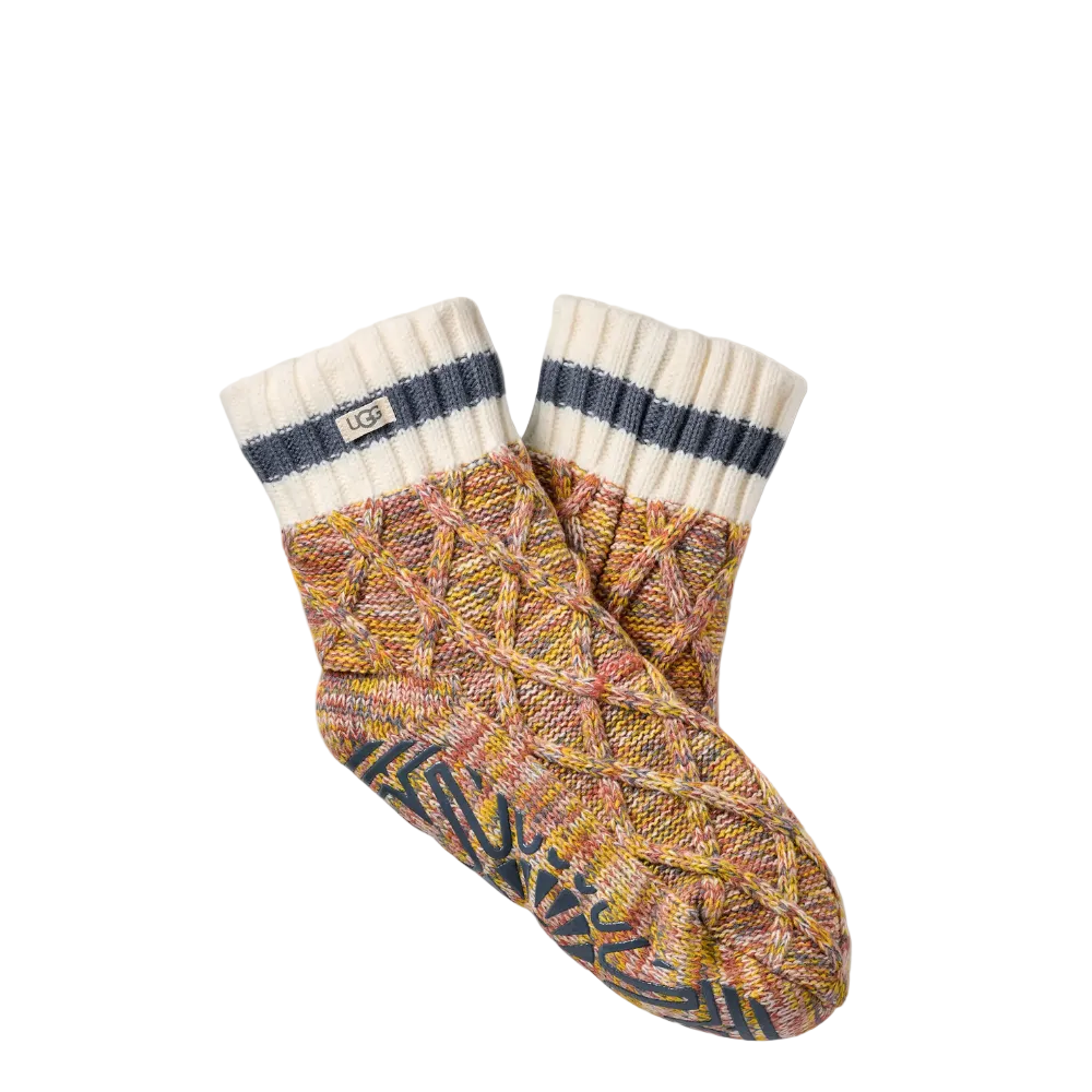 Fluffy, fleece-lined, and finished with The Sun Logo Shape grip for indoor traction, our Deedee Fleece Lined Quarter II has it all. This quarter-height, cable knit sock is crafted with a special plush mélange yarn and finished with The UGG® Logo on the cuff.